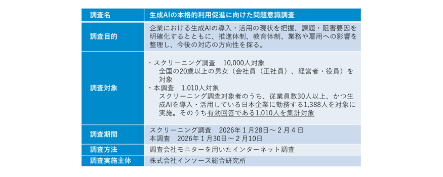 「生成AIの本格的利用促進に向けた問題意識調査」は、企業における生成AIの導入・活用の現状を把握し、日本の企業において生成AIの本格的利用促進を妨げている具体的な課題・阻害要因を明らかにし、その解決策の示唆を得ることを目的としています。また、推進体制や教育体制の在り方などを探り、生成AIが企業にもたらす影響などを整理しました。(2026年4月/株式会社インソース総合研究所)