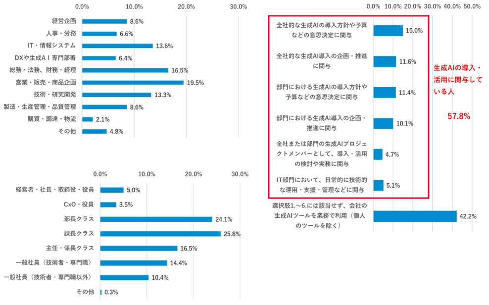 - 回答者は、生成AI活用の意思決定や運営に直接関与している回答者を中心に抽出しましたので、推進者や管理者が6割近くを占めています。