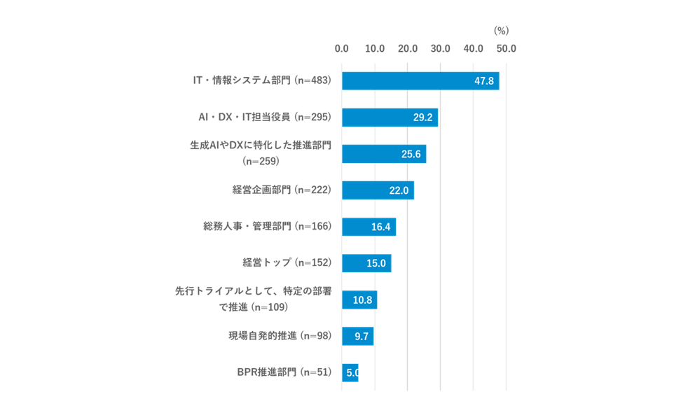 本アンケート調査時点では「IT・情報システム部門」が約半数の企業で推進役を担っており、技術部門主導の導入が主流です。