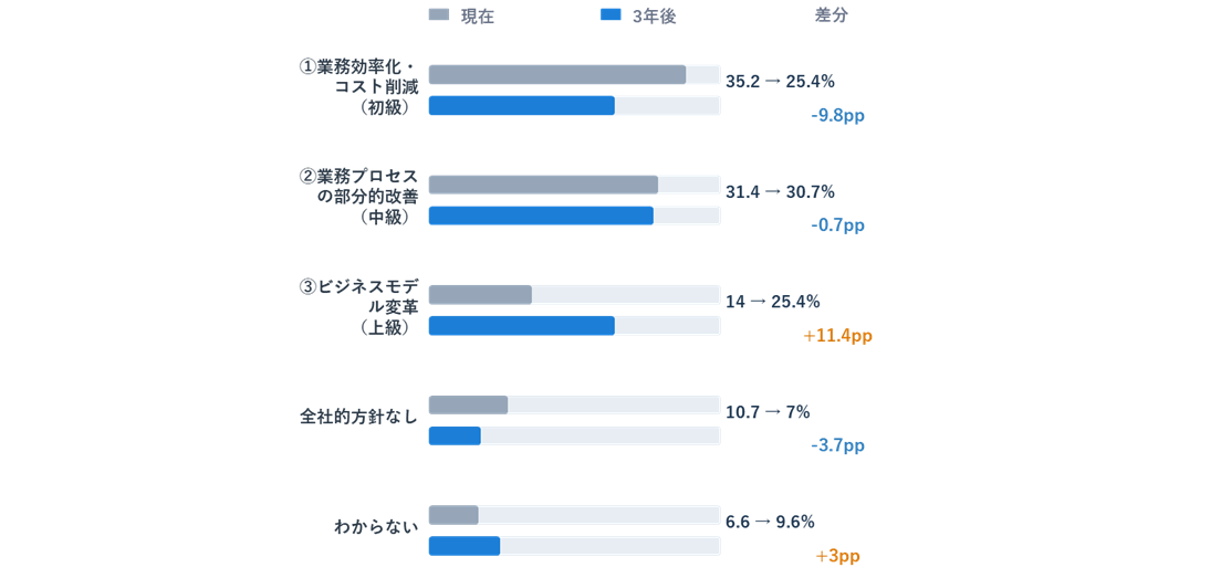 現在は、①業務効率化・コスト削減目的が最多ですが、3年後には10%近く低下し、③ビジネスモデル変革が、11%以上大きく伸長しています。生成AI活用方針が、効率化から戦略的変革へとシフトしていることが明確です。