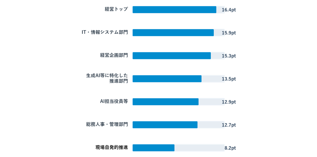 上級活用レベルの業務については、「経営トップ」や「AI担当役員」が推進部門の場合に2割超と高くなっています。