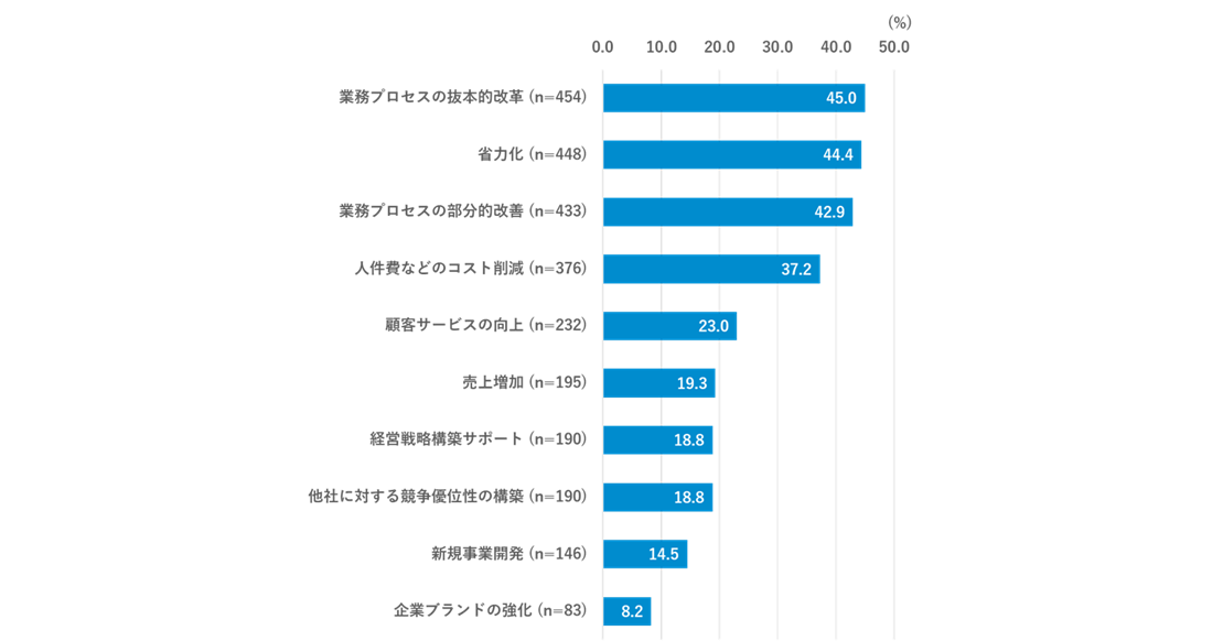 「新規事業開発」、「企業ブランドの強化」への期待度は低く、短期的には攻めの活用より守りの効率化が優先です。