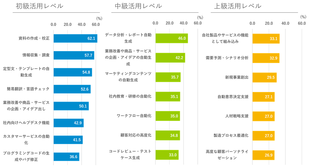 - 初級活用(資料の作成・校正、定型文・テンプレートの自動生成、簡易翻訳・言語チェック、情報収集・調査等)で「全社的な活用」が進んでいます。