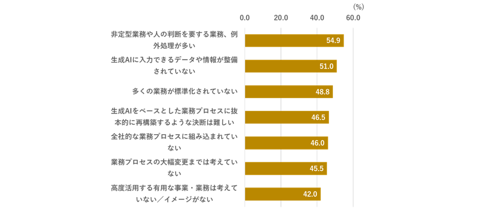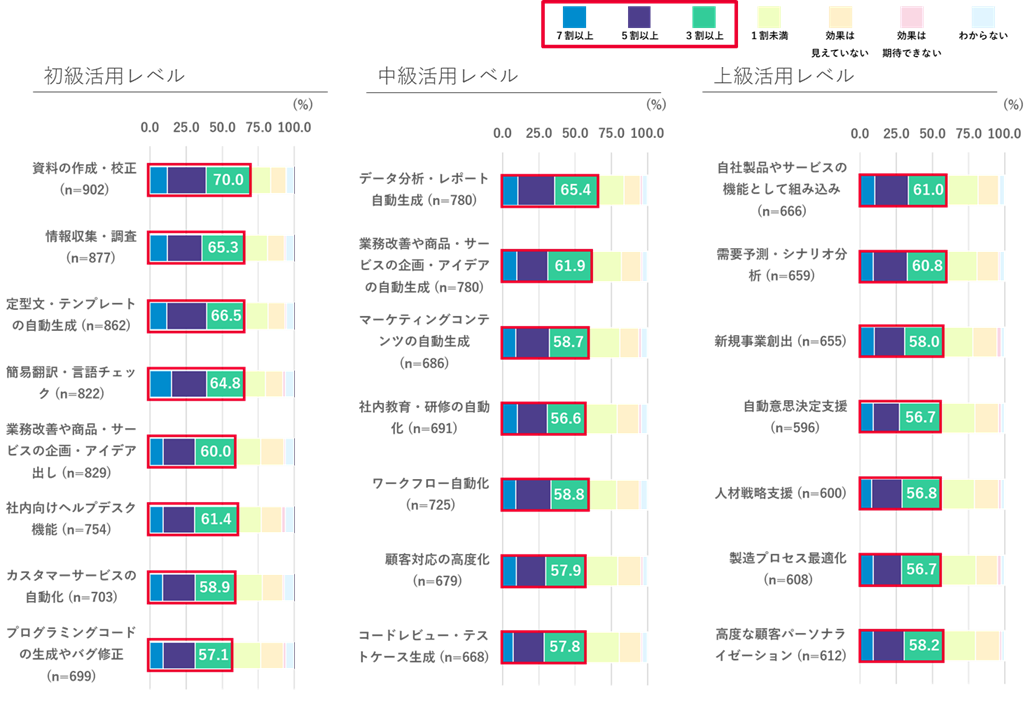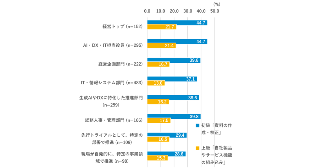 上級活用レベルの業務は、最も戦略的な領域であり、足元の期待は総じて低めになっています。効果の確度を作るのが難しい領域ということがうかがえます。