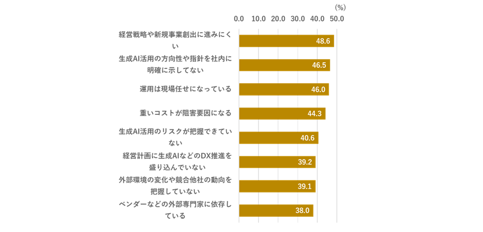 経営層のコミットメントに関する課題では、「経営戦略や新規事業創出に進みにくい」、「生成AI活用の方向性や指針が社内に明確に示していない」、「運用は現場任せになっている」が上位を占めており、経営層のコミットメントの弱さ、社内での認知度や信頼性の低さが浮き彫りになっています。
