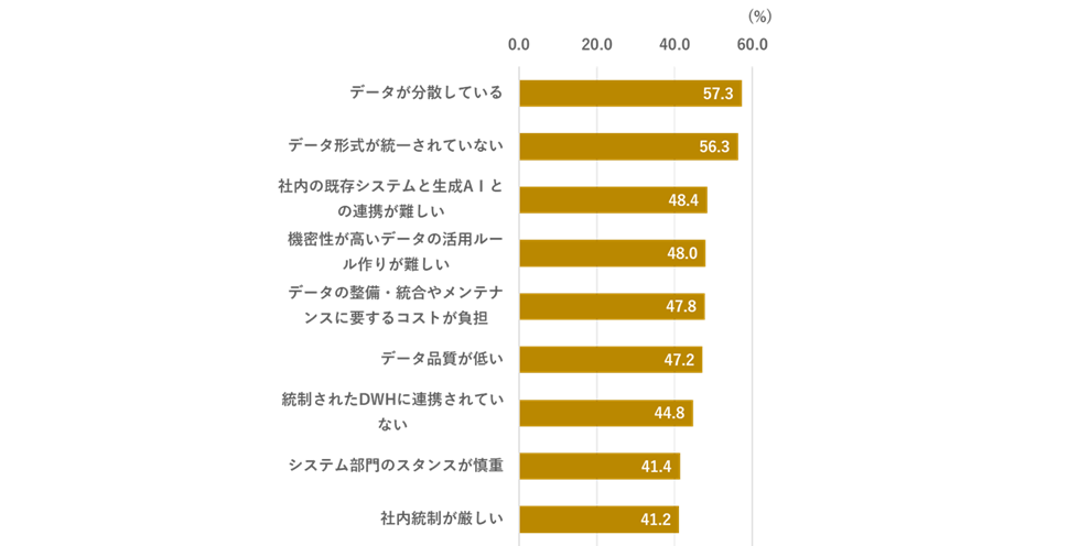 データ活用面では、「データの分散」、「形式の不統一」、「データ品質の低さ」など、統合や標準化の手前で、基盤的なデータ整備の根本的な課題を多くの企業が抱えていることが明確です。
