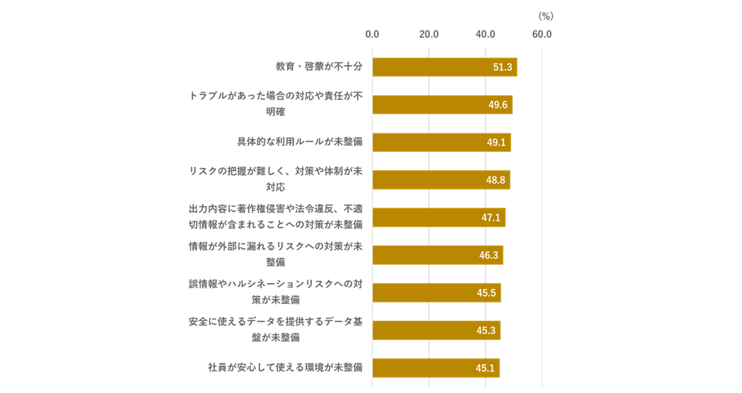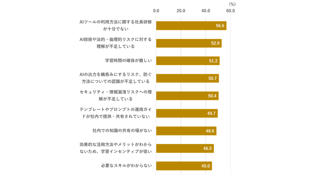 社員のAIスキルやリテラシーでは、「研修機会不足」、「学習時間の不足」、「リスクへの認識不足」がトップの課題としてあげられています。
