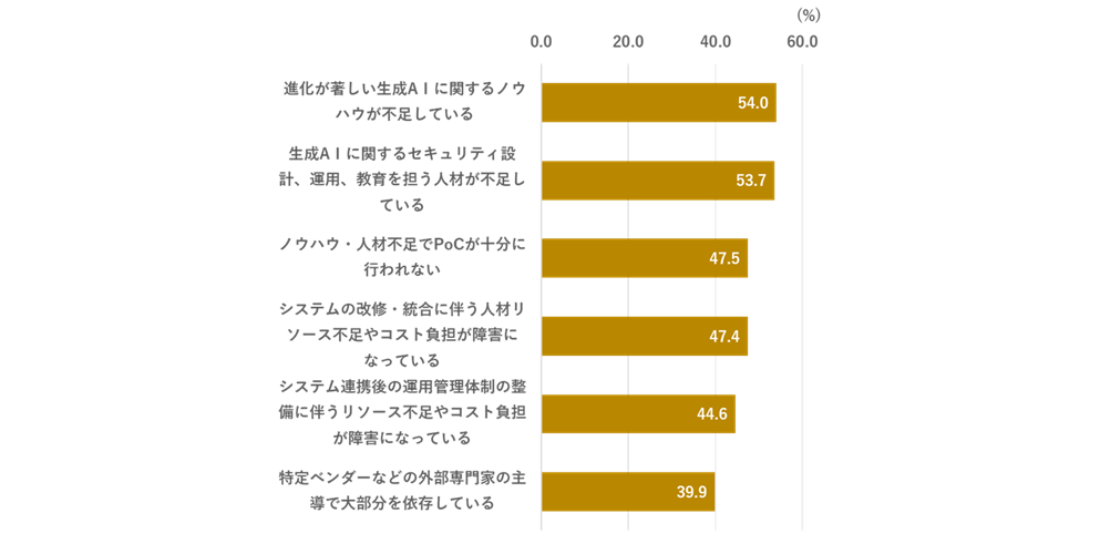 AI人材の確保に関する課題では、「ノウハウ不足」、「人材不足」を最重要課題と考えており、進化の著しい生成AIに人材面・知見面で追いついていない状況が確認できます。
