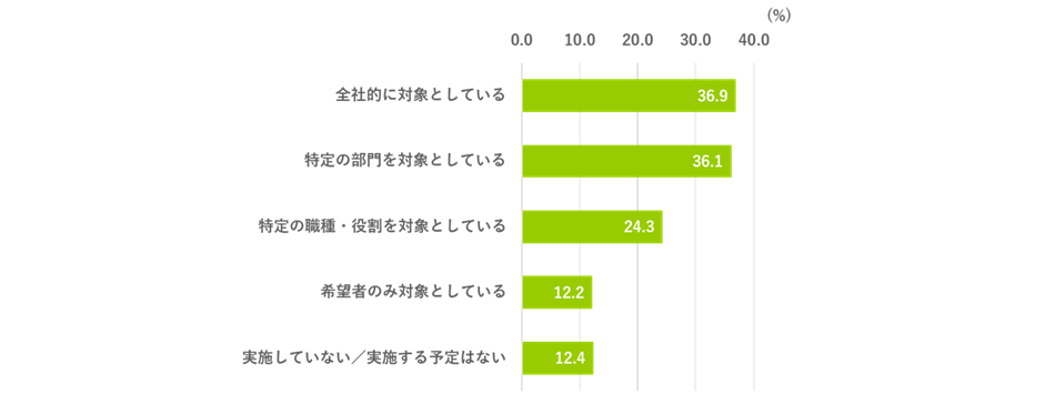 生成AI活用に関する社内研修や教育プログラムを「全社対象」に実施している企業は、まだ4割に満たないようです。