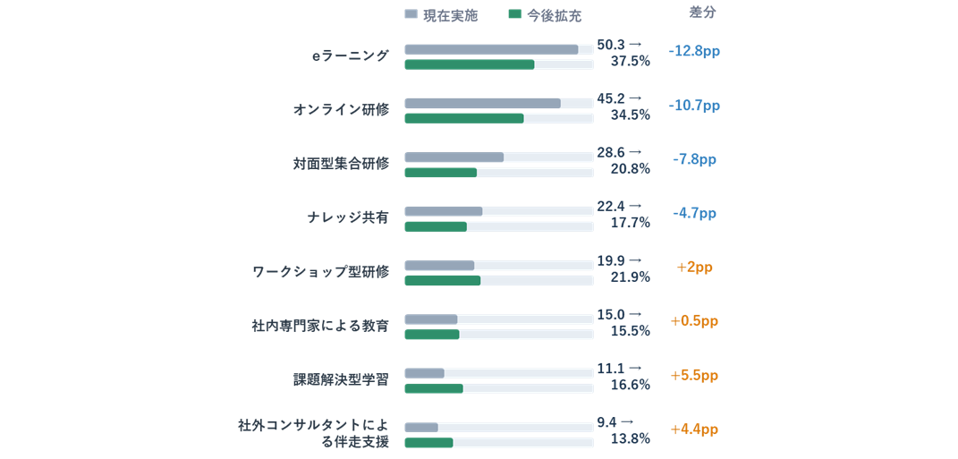 ただし、今後拡充したい生成AI教育の形式としては、“eラーニング”などが低下傾向にある一方で、“ワークショップ型研修”、“課題解決型学習”、“社外コンサルタントによる伴走支援”で希望実施率が現在実施率を上回っています。