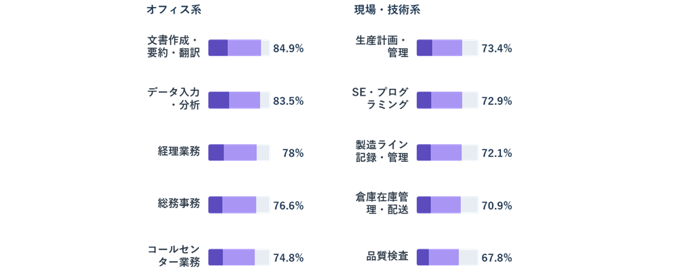 今後2年の間に、どのような業務が、どの程度代替されるかの予測では、まず、オフィス系業務においては、定型的・反復的な知識労働が最初に代替される傾向があります。