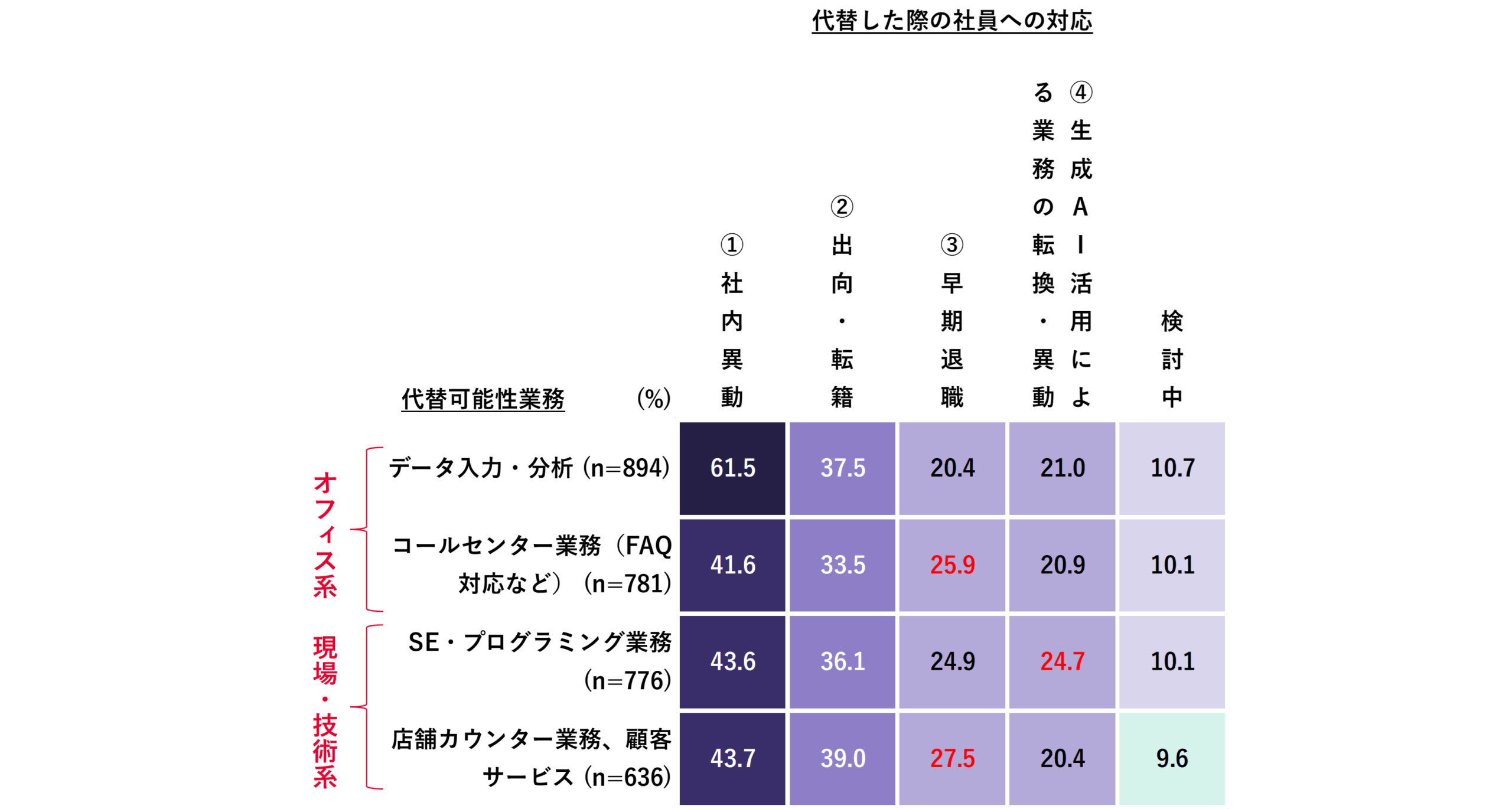 現時点での、日本企業における代替後の対応策としては、早期退職よりも社内の再配置や配置転換で吸収しようとする方針が強いですが、受け皿は十分ではありません。今後は、④の生成AI関連の新業務の拡大と、その新しい受け皿への転換への期待が高いと推定されます。