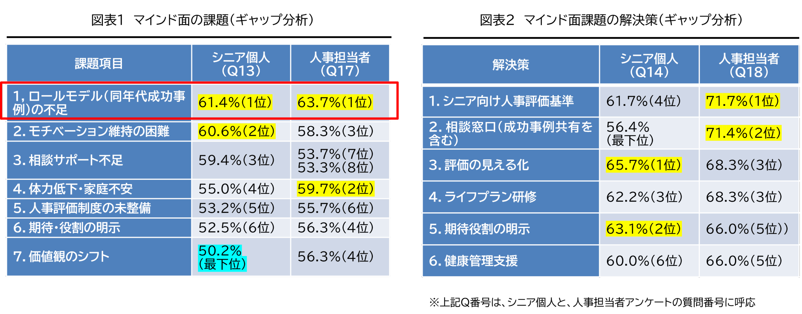 〇一方で、マインド面の課題解決策の選択肢において、シニア個人と人事担当者のギャップは大きい。これはシニア個人が、まずは「評価を見える化」して、「期待役割を明示」してほしいという短期的で分かりやすい要求をしていることに対して、人事担当者では、その先の抜本的な施策「人事評価基準」の策定を目指している故のギャップと推定できる。