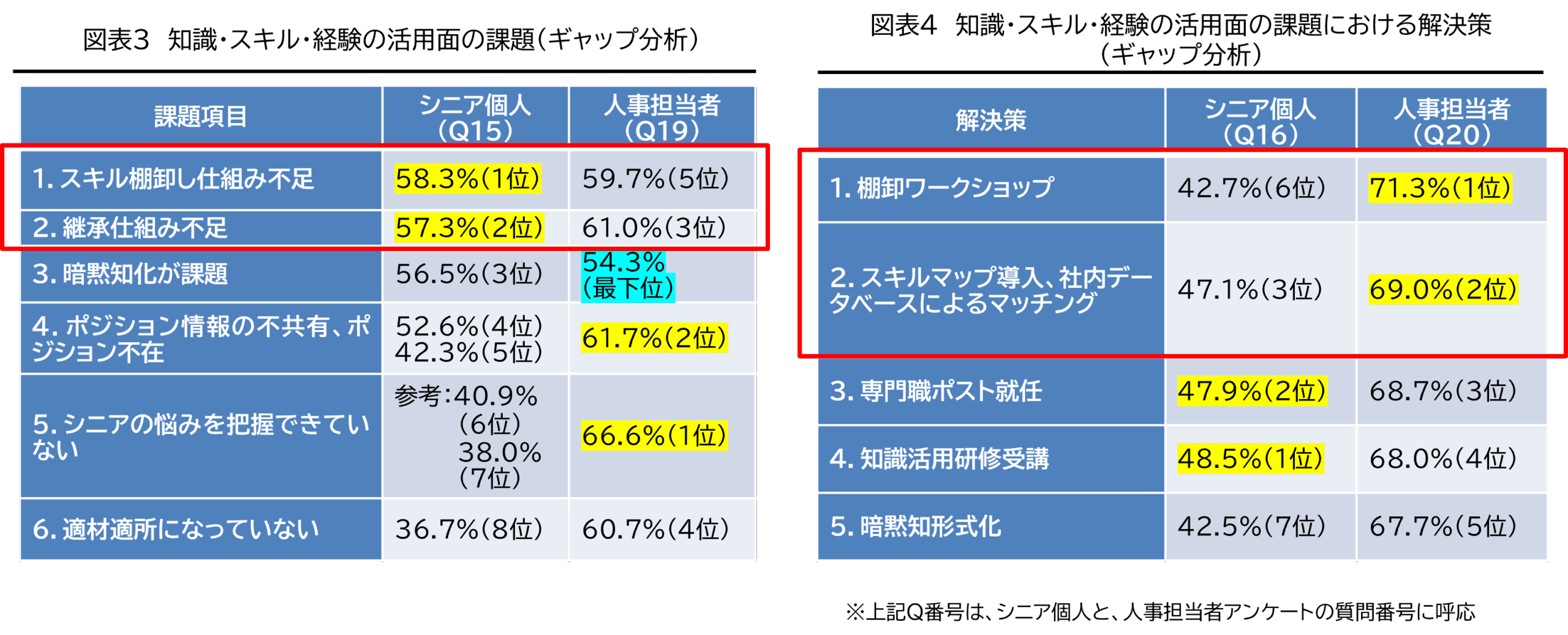 〇しかし、解決策においては、人事担当者側が最も支持する解決策として「スキル棚卸しワークショップ」や「スキルマップ導入と社内マッチングシステム」を選択していることから、ここにギャップはなく、これらの施策を最優先させることが効果的だと推定される。