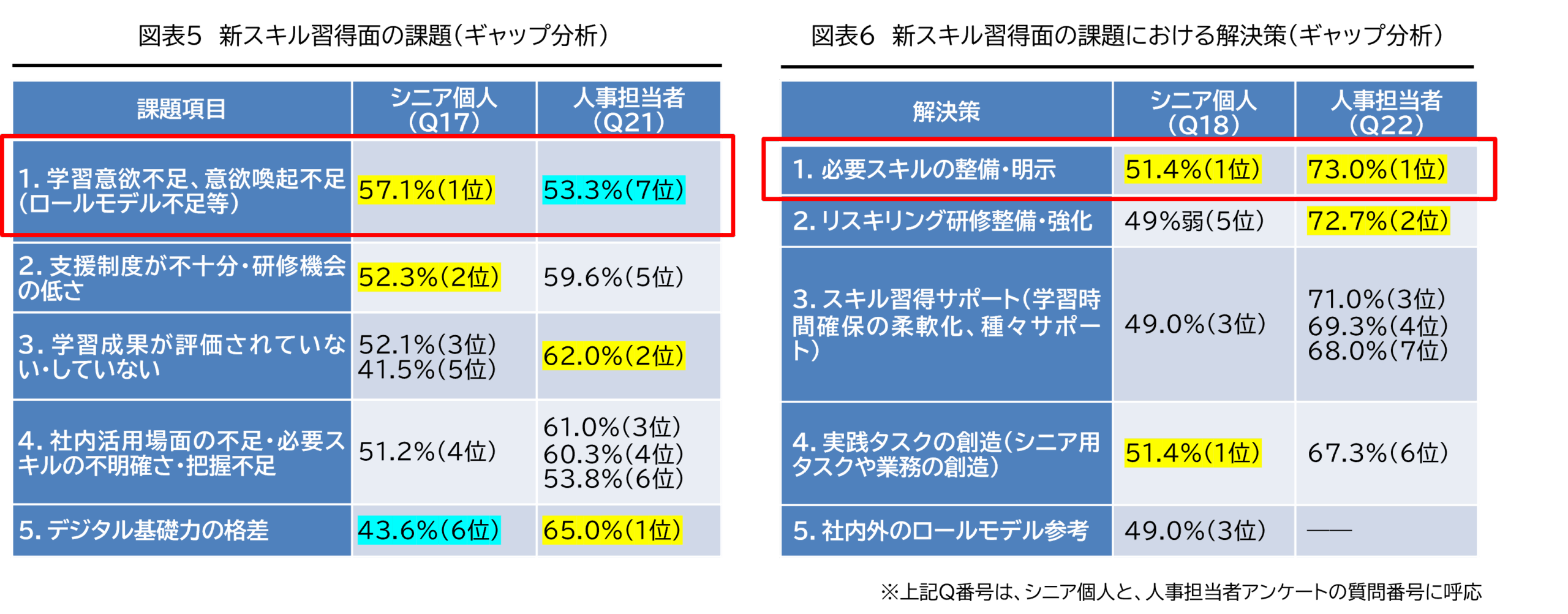 〇新スキル習得面での最大の課題は、特にシニア個人にとって「何を学ぶべきかわからない」ことである(図表5) 。それが、シニア個人の「学習意欲不足」、「支援制度不足」の課題につながっている。そのため、「必要スキルの整備・明示」が、シニア個人と人事担当者の双方で最も支持される解決策になっており(図表6) 、この領域でまず着手すべき施策である。