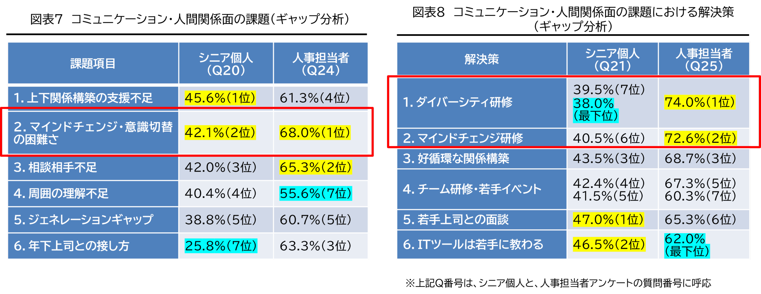 〇シニア個人が、人間関係面で2番目にあげた課題は「マインドチェンジの困難さ」であり、人事担当者の課題認識もトップになっている(図表7) 。