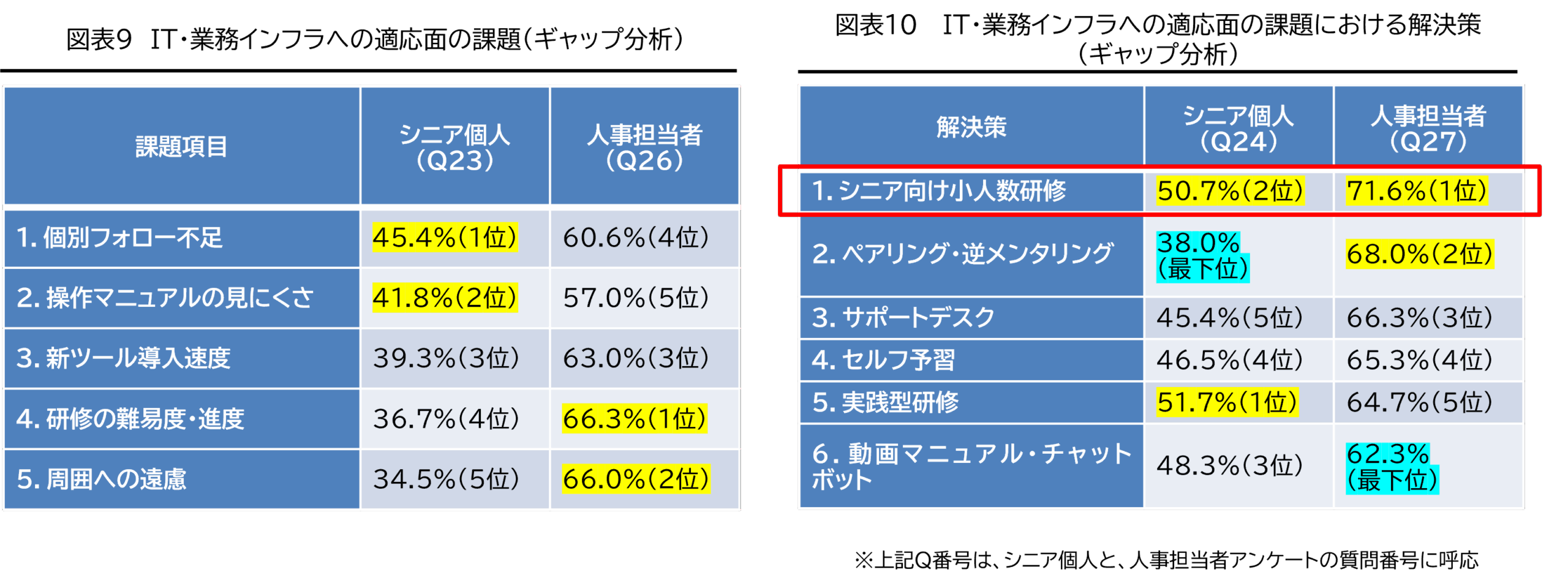 〇「シニア向け少人数研修」以外は、双方のギャップが大きいため、人事担当者が施策を立てる際(特に、逆メンタリング、サポート体制等)には、シニア個人の心理的負担や、身体的負担に配慮しながら進める必要がある。マニュアル作成の際にも、文字サイズやワード選択等にも配慮が必要である。
